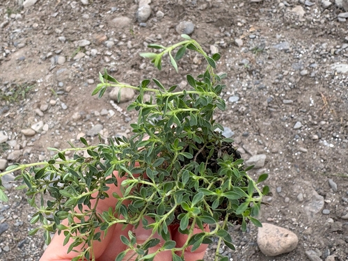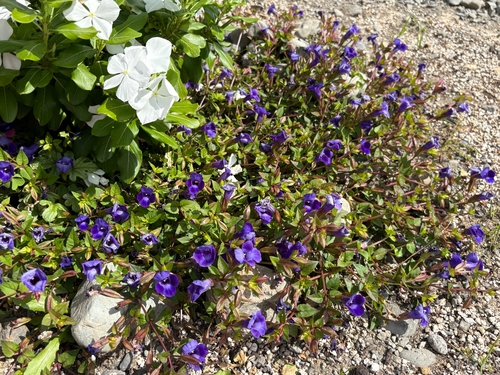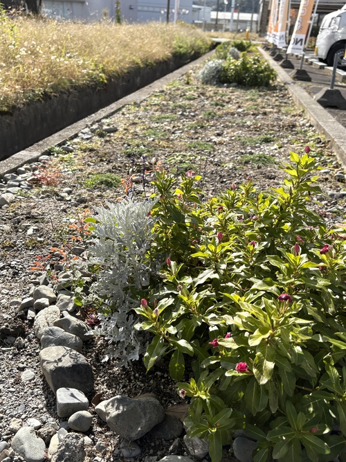 ニチニチソウとブルーラベンダーが盛っり盛りに咲いた真夏、花壇間がより殺風景さを増したし、砂ぼこりが厳しいので、グランドカバーになる植物を植えることにしました。 |