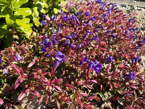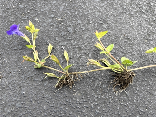 花壇のスーパートレニア カタリーナ アメジストは、地面についた節から根っこが出る程強いお花ですが、露地では冬越しができないため、挿し枝で冬越しさせようと土と水に差してみました。