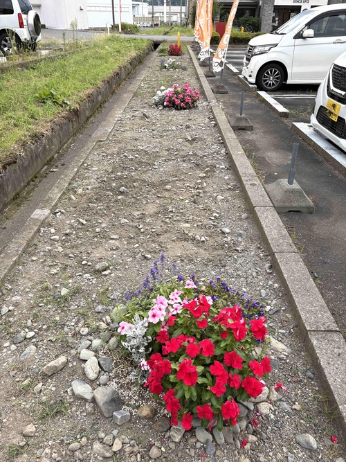 弊社ショールーム駐車場東の水路脇の土地 除草剤を撒き殺風景な瓦礫地だったところに、直径60cmの花壇を5つ作り花苗を植えました。