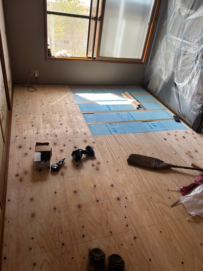 フローリング材を貼る前に、下地になるベニヤ板を貼っていきます。