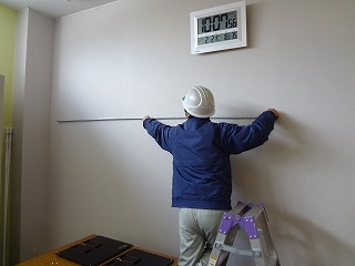 東側の壁の時計の下に取り付ける為、寸法出しをしています。
