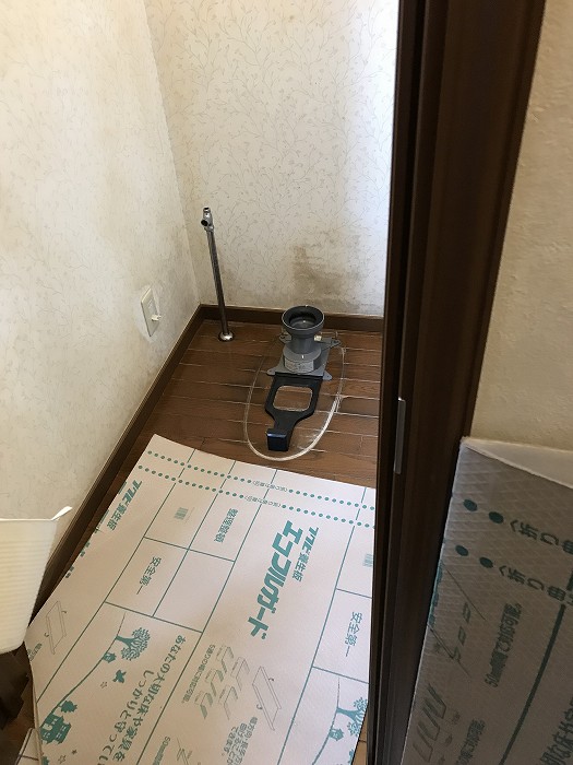 便器自体は交換せずに、天井と壁のクロスの貼り変え工事です。便器の後ろの部分は手が入らないので、今回は 一度便器を外させていただいてから、内装工事を行い、便器を戻すやり方にて行いました。そうすることで、今後便器のみの交換工事をする際、タンクレストイレにしても(タンクの裏にも)壁紙がきちんと貼られているので、その部分だけ追加でクロス工事をしなくてもOKとなります。