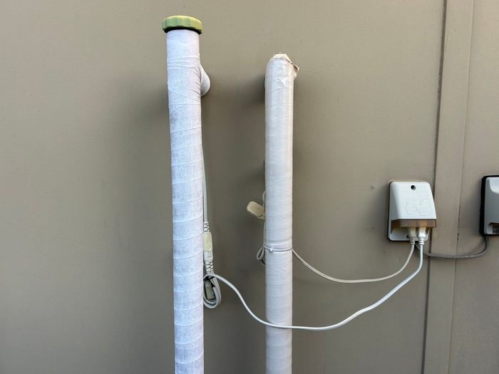 屋外でむき出しになっている水道管には、保温チューブや布を巻いて保温し、その上からビニールテープなどを巻いて防水してください。