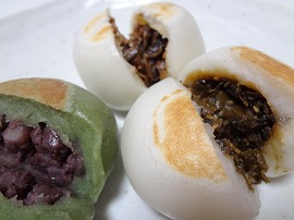 中身は野沢菜 / あんこ / 甘辛きのこ と、ほぼ”おやき”にあるような具。