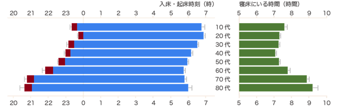 眠りの質は年齢とともに変化し、高齢になるにつれて、眠りが浅くなります。高齢者は若年者より深い眠りが少なく、小刻みに中途覚醒しています。眠りが浅いと、尿意やちょっとした物音でも目覚めやすくなり、「睡眠時間が短い」「熟睡していない気がする」と感じやすくなります。