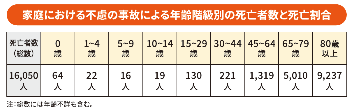 厚生労働省の「人口動態統計」(2023年)によると、家庭における不慮の事故で亡くなった人は16,050人でした。同年、交通事故で亡くなった2,678人に対し約6倍の人が家庭内の事故で亡くなったことになります。家の中だから安全とは決して言えないのが現状です。