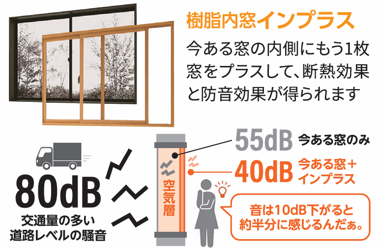 今ある窓の内側にもう1枚窓をプラスして、断熱効果と防音効果が得られます。